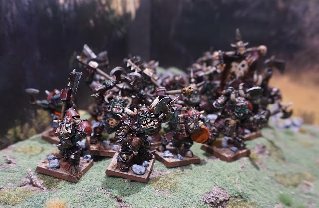 The minis come from different periods and manufacturers. We have there old Citadel Black Orcs, some are more recent Citadel ones and the others are Iron Orcs from Knightmare Miniatures.